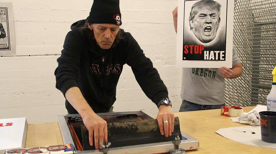 The Stop Hate poster was also one of the first posters printed at the Haight Street Art Center, in San Francisco. Banding together with other artists (Chuck Sperry, Alexandra Fischer, John Mavroudis, and Lauren Yurkovich), we produced numerous posters, both silkscreen and offset, distributed in Washington DC, Oakland, and San Francisco at the Women’s marches. A huge thanks to everyone that helped.