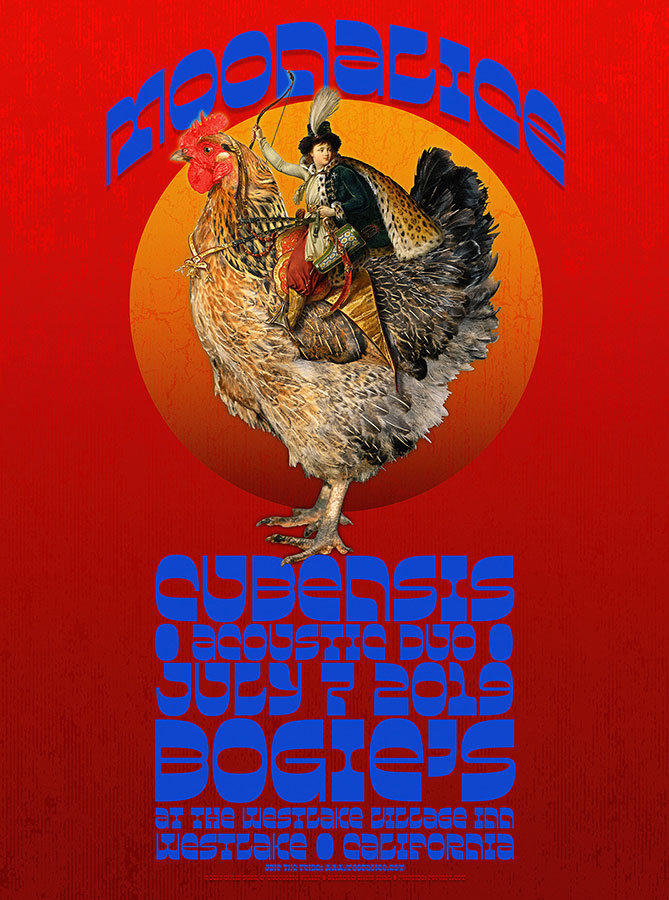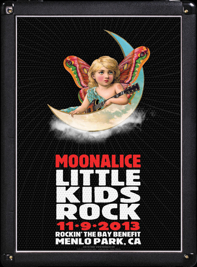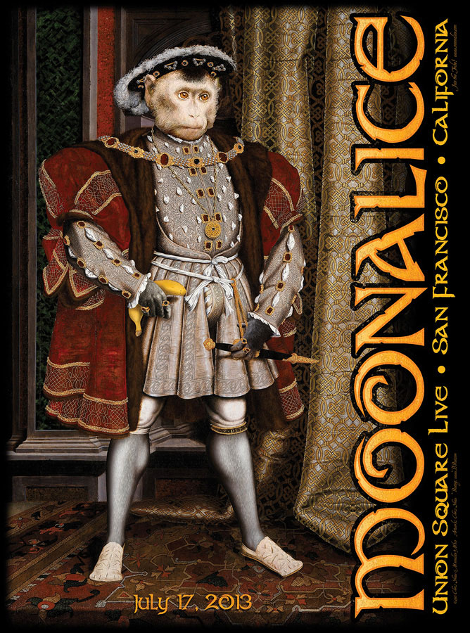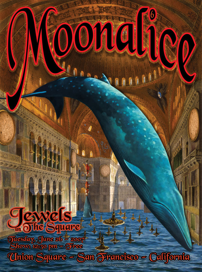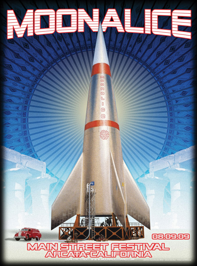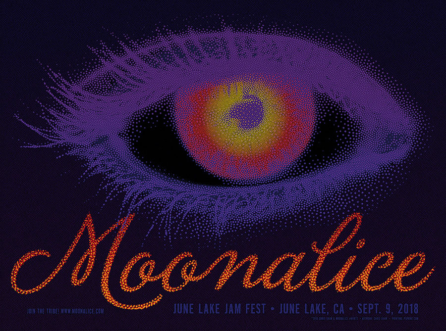 “ Moonalice is a band that has made free posters for every show for over 15 years. I created the first Moonalice poster in 2007, as the band began to play more I couldn’t keep up with the amount of art needed to produce a unique poster for every gig. Reaching out to other artists to help fulfill the immense amount of art needed, eventually the series included the work of dozens of artists, including some rock poster legends. I love working with other artists, and created a series where artists can do what they do best – make art. A massive thank you to the band Moonalice and Roger McNamee for their ongoing support of rock poster art – and to all the artists who have contributed to this amazing series of posters.”