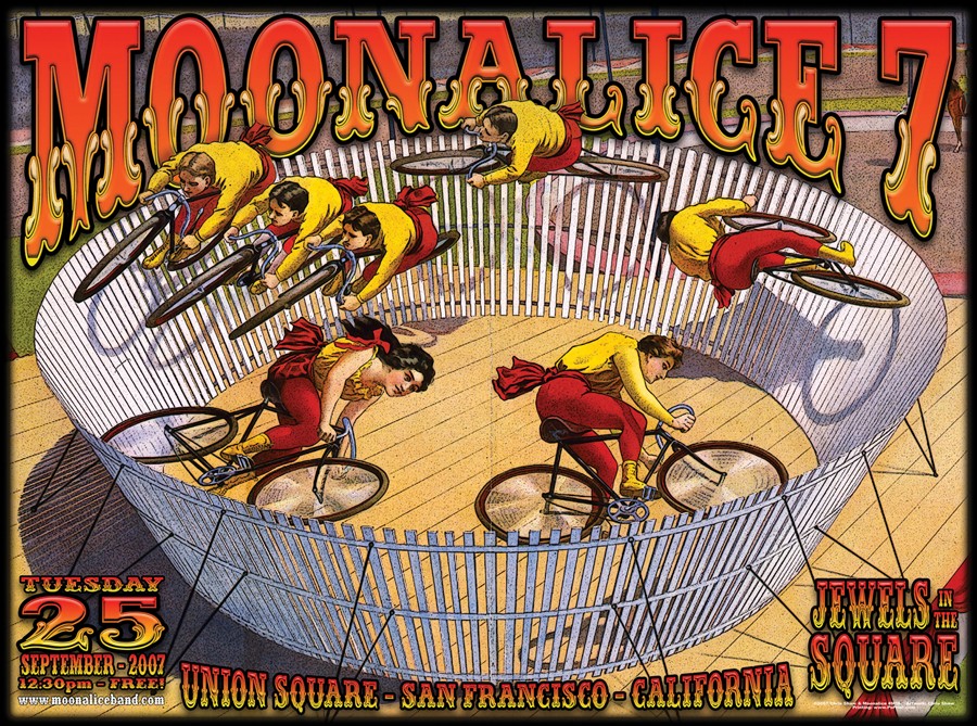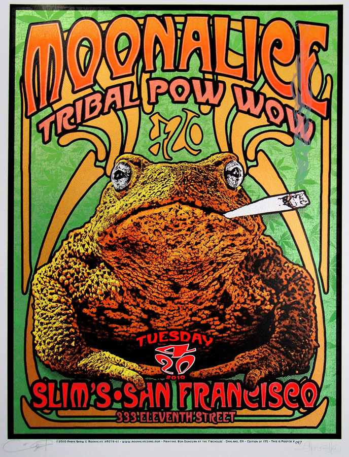 “ Moonalice is a band that has made free posters for every show for over 15 years. I created the first Moonalice poster in 2007, as the band began to play more I couldn’t keep up with the amount of art needed to produce a unique poster for every gig. Reaching out to other artists to help fulfill the immense amount of art needed, eventually the series included the work of dozens of artists, including some rock poster legends. I love working with other artists, and created a series where artists can do what they do best – make art. A massive thank you to the band Moonalice and Roger McNamee for their ongoing support of rock poster art – and to all the artists who have contributed to this amazing series of posters.”